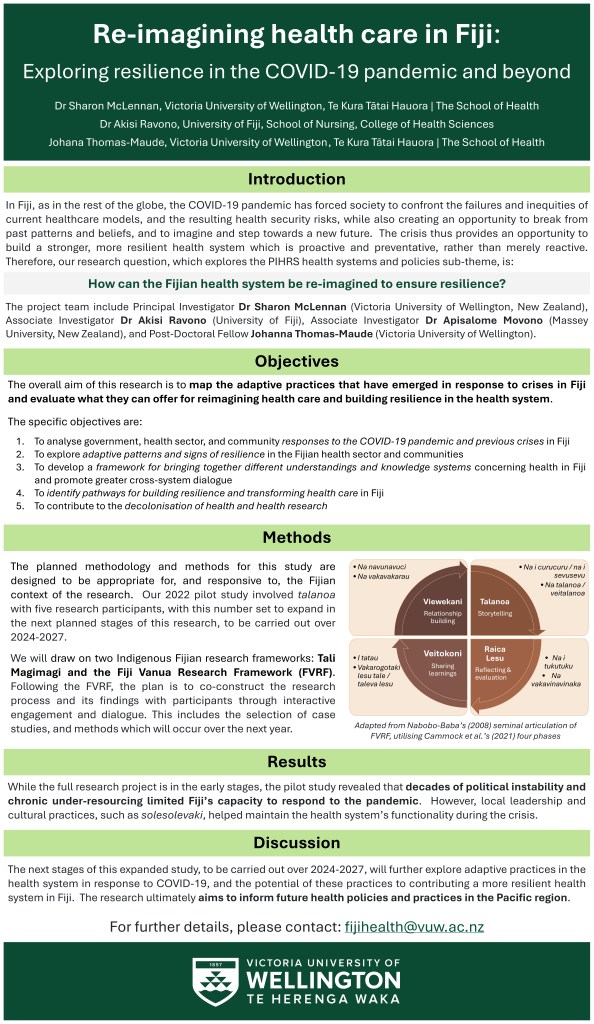 The team attended the Pacific Island Health Researchers Symposium in Nadi, Fiji in September 2024, where they presented a poster entitled: Re-imagining health care in Fiji: Exploring resilience in the COVID-19 pandemic and beyond.